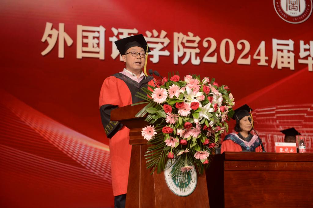随后,外国语学院院长罗德喜发表毕业致辞。首先,罗院长代表外国语学院全体师生向2024届毕业生表示最热烈的祝贺。他感谢所有在过去1460天里辛勤耕耘、默默付出的教师们及默默在背后帮助和支持的家长们,是她们用世界上最好的“爱”温暖了学生,激励着她们前行。他对毕业生表达了三点期许:一是希望同学们作为年轻一代,要增强文化自信,贡献自己的一份力量去提升民族文化软实力;二是要履行好文化使者的角色,用英语去讲好中国故事,传播好中国声音;三是终身学习,做到博采众长。希望同学们无论走得多远、飞得多高,都要常回母校看看。