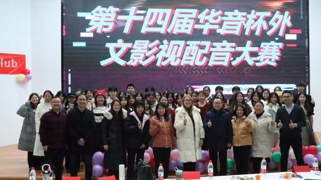 近日,由外国语学院主办、英语俱乐部承办的第十四届“华音杯”外文影视配音大赛决赛在南湖校区教二楼117报告厅举行。出席本次配音大赛的嘉宾有外国语学院院长罗德喜教授、英语俱乐部指导老师陈俊明、外教Anna、徐霞、马娟、董文静、石雯雯、刘江涛、张孟杰、李萍等九位老师和往届冠军代表担任了本次比赛评委。外国语学院师生代表和学校其他社团代表也观看了本次配音大赛。
