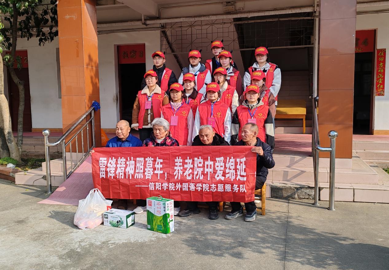 在第62个学雷锋纪念日到来之际,为深入学习贯彻党的二十届三中全会精神,落实习近平总书记关于志愿服务的重要论述和重要指示批示精神,弘扬“奉献、友爱、互助、进步”的志愿精神,2025年3月8日上午,外国语学院志愿服务队前往信阳市平桥区前进敬老院,开展了一场以“雷锋精神照暮年,养老院中爱绵延”为主题的志愿服务活动。