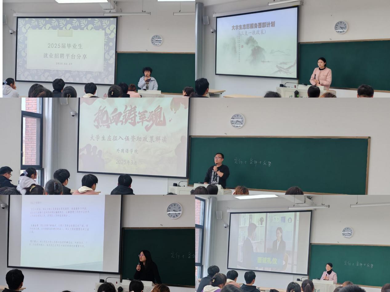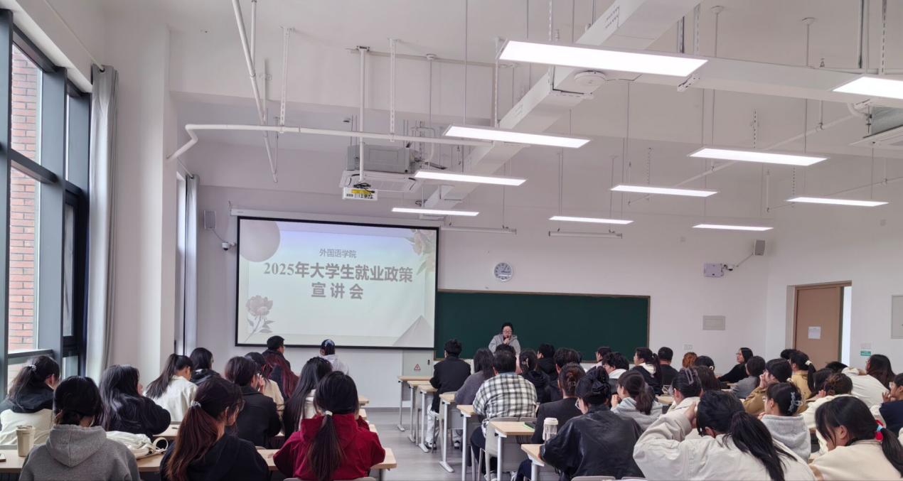 为深入贯彻落实国家关于促进高校毕业生就业的重要部署,帮助同学们全面了解最新就业政策,把握职业机遇,外国语学院于3月29日下午召开大学生就业政策宣讲会,毕业班全体辅导员以及我院学生100余人参加会议。本次宣讲会在南湖校区教二楼410教室召开,由王萌主持。