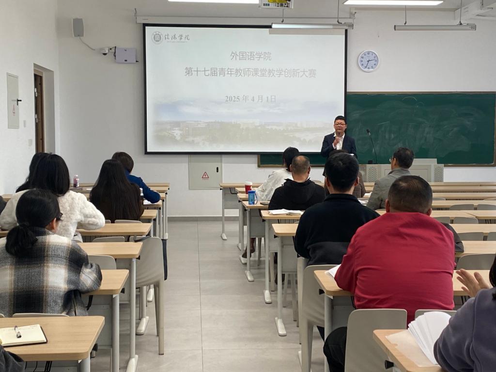 为推动课堂教学革命,加强青年教师教学队伍建设,促进青年教师教学能力提升,全面提高学校外语教育教学质量,4月1日下午,外国语学院在教二楼415举办了第十七届青年教师课堂教学创新大赛初赛。本次比赛邀请了教学副院长李静、特聘教授、校级督导专家段云虹、校级督导专家郭耀忠、翻译教研室主任梁法丽以及第五届河南省本科高校教师课堂教学创新大赛外语教学赛道大学英语视听说组二等奖获得者高蕊担任评委,外国语学院领导班子成员及全体教师全程观摩了此次大赛。比赛由教学干事李达主持。