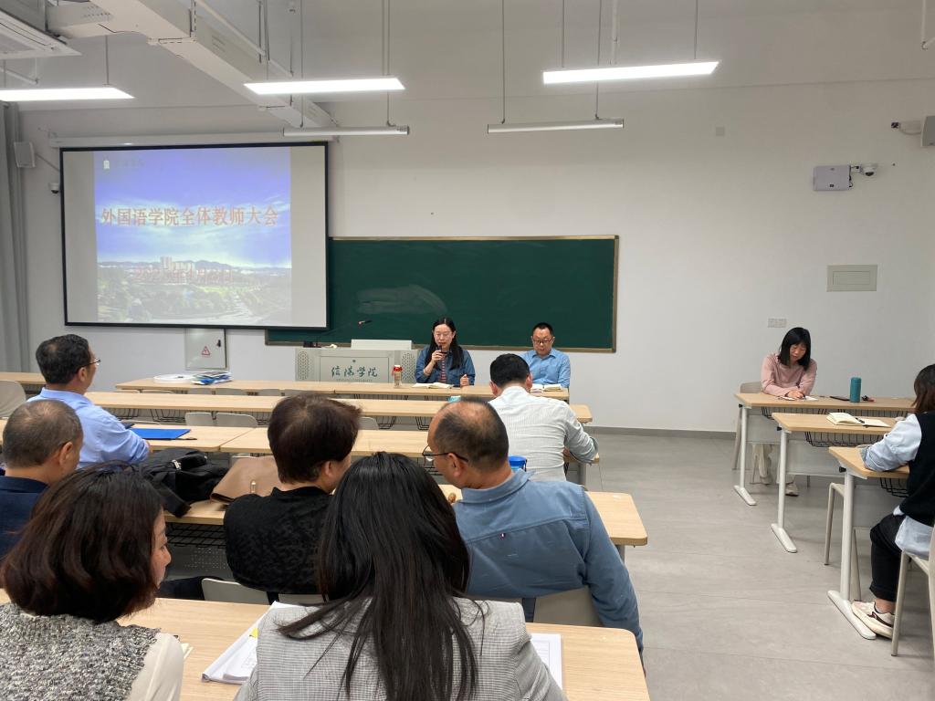 为推动学院各项工作顺利开展,4月8日下午,外国语学院召开期中全体教师大会。外国语学院班子成员和全体教师参加了会议。会议由程娇炎主持。