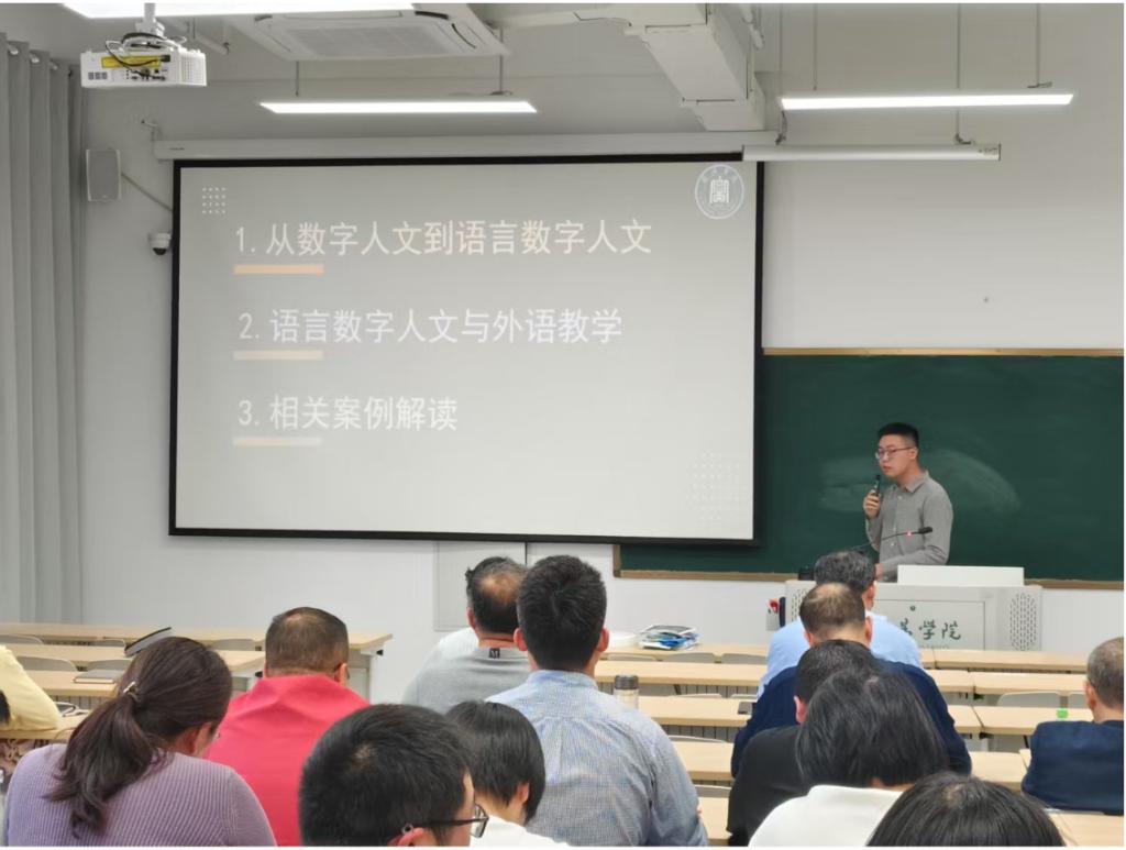 为顺应数智时代潮流,提升教师的数字素养和数字化教研能力,4月10日下午,外国语学院语言文学教研室在南湖校区教二楼412教室举办了一场主题为《语言数字人文:理论源流及案例解读》的教研活动。外国语学院班子成员、专家教授以及全体教师积极参加了本次活动。活动由青年教师沈炳坤老师担任主讲,英语语言文学教研室主任周善春老师主持。