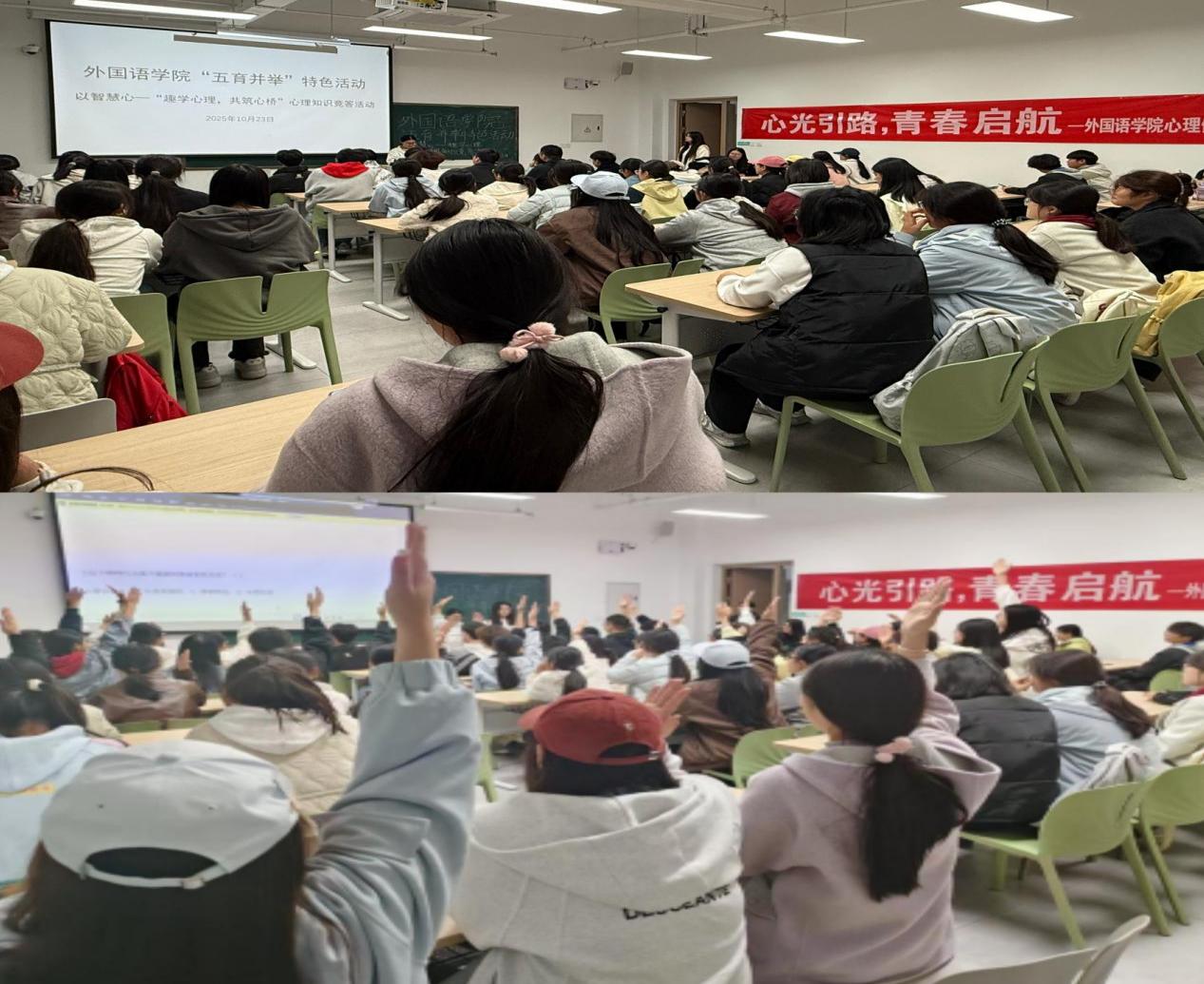 10月23日晚,“趣学心理,共筑心桥”心理健康知识竞答活动在同一地点火热开展。来自外国语学院各班的参赛选手以个人为单位同台竞技,通过紧张激烈的抢答环节,普及心理健康常识,提升心理自助与助人能力。最终,10名表现优异的同学获评“心理健康知识达人”并获颁证书。活动寓教于乐,有效提升了学生对心理健康的关注度与认知水平。竞答现场,选手们紧盯题目屏幕,抢答器按键声与讨论声交织:从“情绪调节小技巧”到“人际边界的建立”,每道题都引发现场思考。