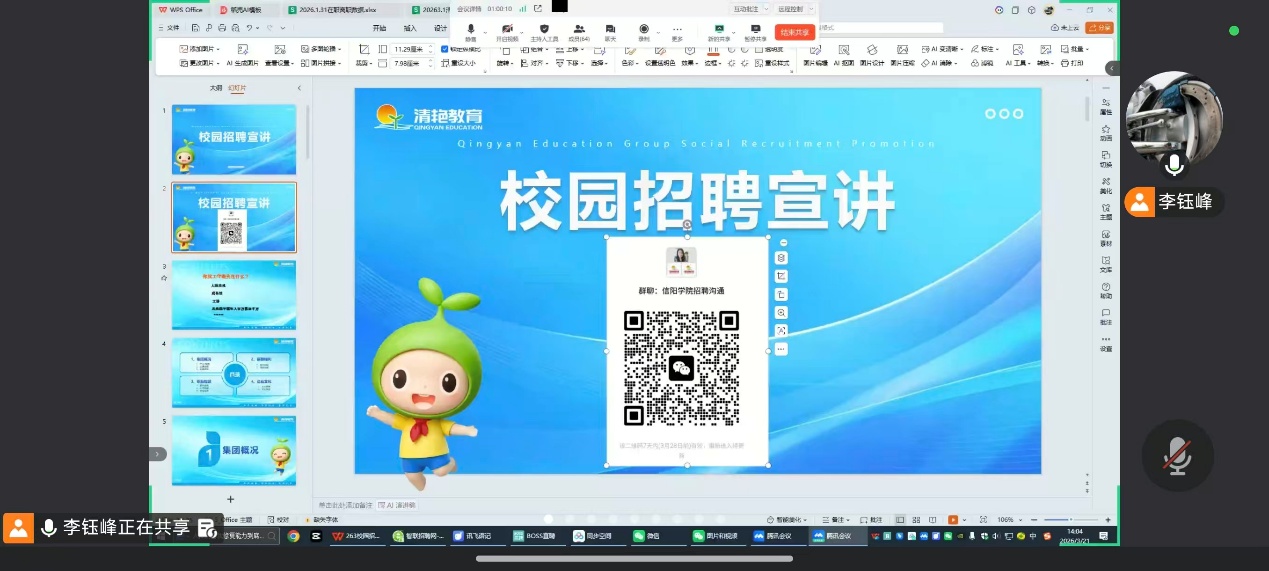活动中,清艳教育集团宣讲团队通过屏幕共享,全面介绍集团发展历程、核心业务、企业文化及办学使命,详细展示这家深耕教育领域、拥有近百所校区的综合性教育集团的发展实力;集团人力资源负责人同步解读招聘岗位任职要求、薪资福利、职业发展路径及岗前培训计划,明确岗位适配标准,让毕业生全面掌握企业招录信息。