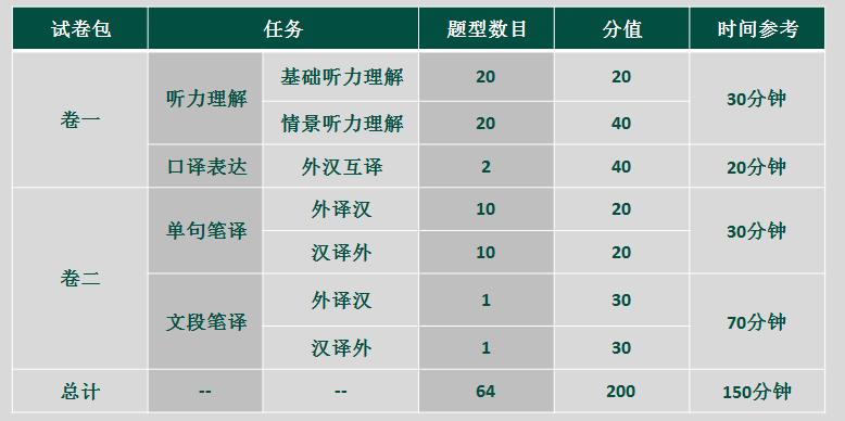 1.考试内容:考试满分200分,时间150分钟,分口、笔译两张试卷。听力理解、口译表达一张试卷;单句笔译与文段笔译一张试卷。(题型数目、分值和参考时间分配请参照下表)
