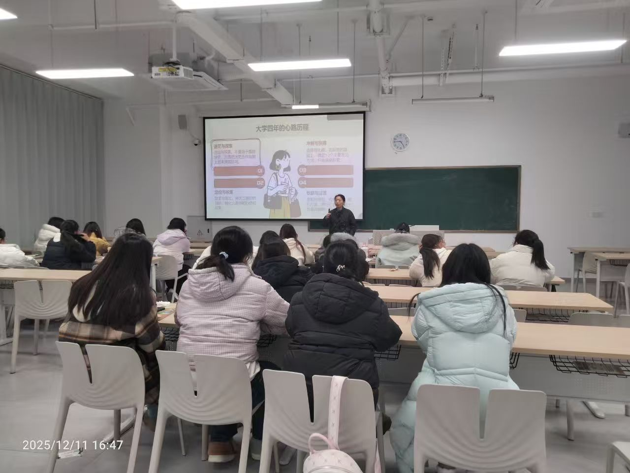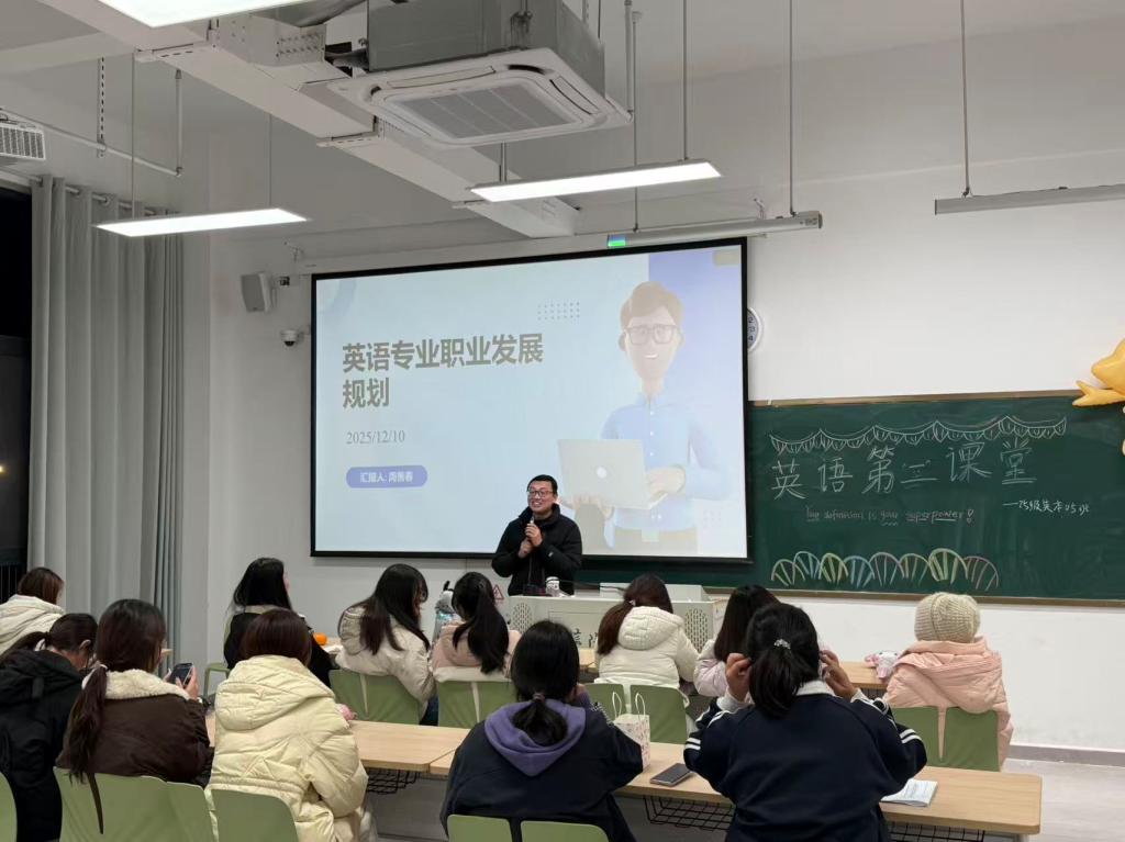 12月11日,陈艳老师以“英语专业全景透视”为题,为同学们带来了一场高屋建瓴的专题分享会。陈老师从学科架构的宏观视角切入,深入浅出地剖析了外语学科的内涵与外延,打破了学生对英语学习仅限于“背单词、练口语”的刻板印象。她结合当前社会发展趋势,从成长路径、职业前景等维度进行了多角度解读,鼓励学生不仅要精进语言技能,更要拓宽知识面,培养跨文化交际能力。在互动环节,陈老师耐心解答了同学们关于考研方向、跨专业学习的困惑,为学生深化专业认知、明晰学业规划提供了极具价值的启发。这场讲座不仅是一次知识的传授,更是一次思想的洗礼,帮助学生在纷繁复杂的大学生活中找准了定位与方向。