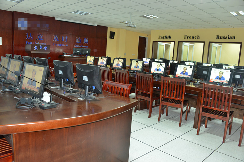 外国语学院同声传译实验室是目前国内同类产品中功能比较强大和专业的同声传译系统。该实验室设备完善,管理规范,使参与者对同声传译有一个身临其境的感受,在观摩模拟情景的同时受到良好的熏陶和锻炼,使学生的外语应用能力在实践中得到提高,为本学院学生进行专业化训练提供了强大的保证。